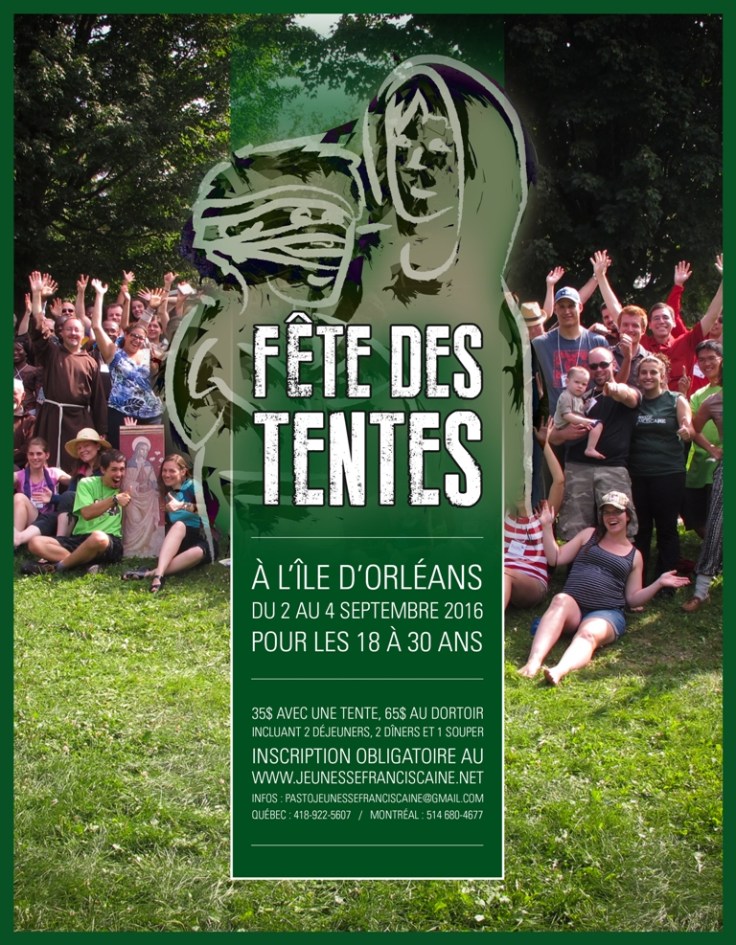 La Fête des Tentes, c’est une fin de semaine de ressourcement fraternel franciscain pour jeunes adultes entre 18 et 30 ans. On y vit la messe, des ateliers variés, une soirée d’adoration Eucharistique et un grand rassemblement autour d’un feu de camp. C’est un temps remplis de musique, de chants, de prières, de simplicité, de joie, de rires, de retrouvailles et d’amitiés naissantes. Tout ça dans la belle nature de l’Île d’Orléans!