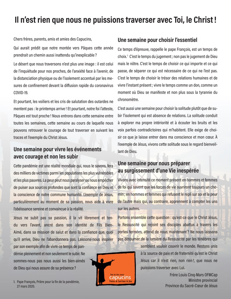 Nous vivons cette année une semaine sainte comme jamais auparavant. Avec tous nos concitoyens, nous la vivons en contexte de confinement, de distanciation physique et de fermeture de tous les lieux de cultes.