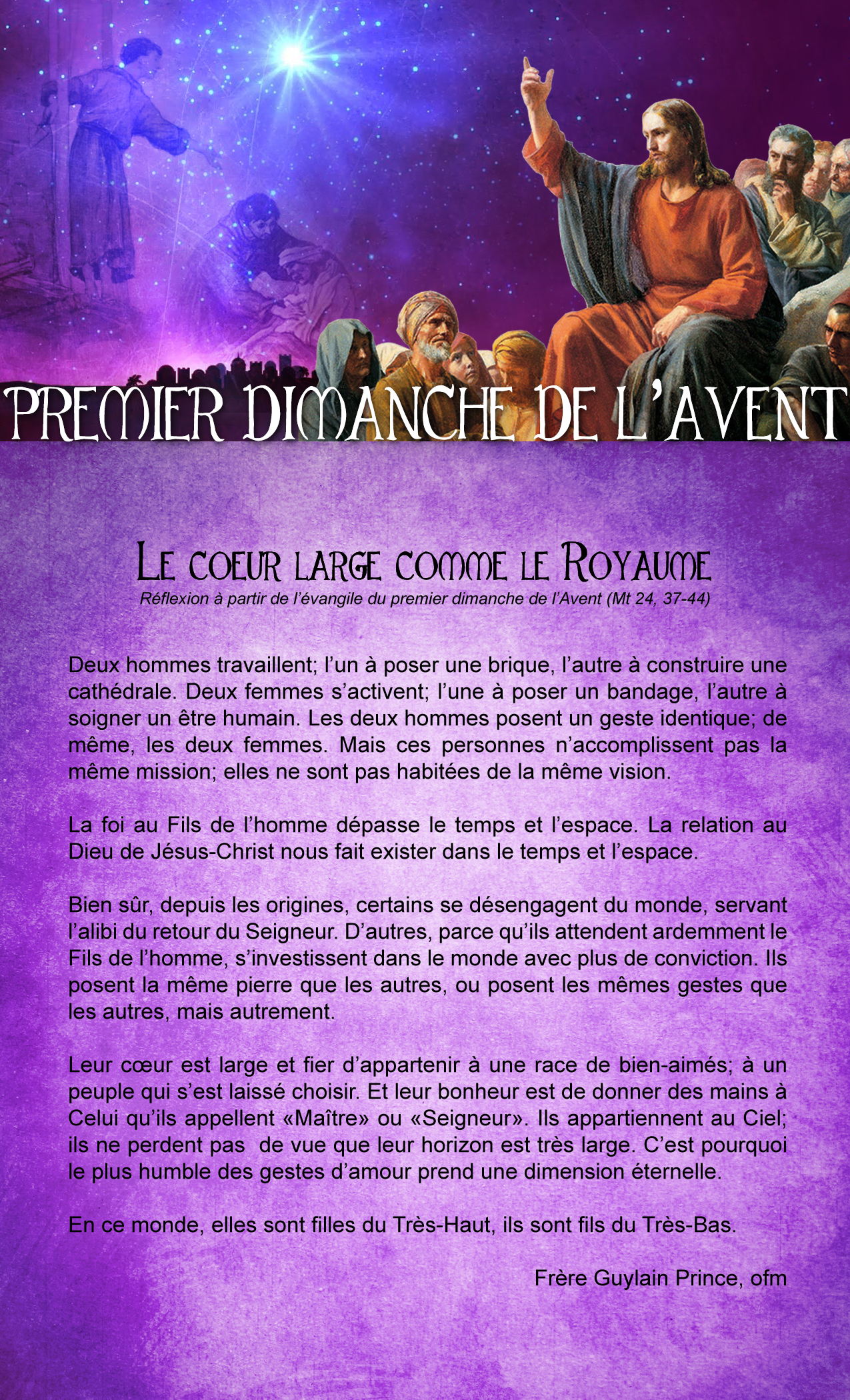 Réflexion de frère Guylain Prince (Franciscain) à partir de l’évangile de ce jour (Mt 24, 37-44).