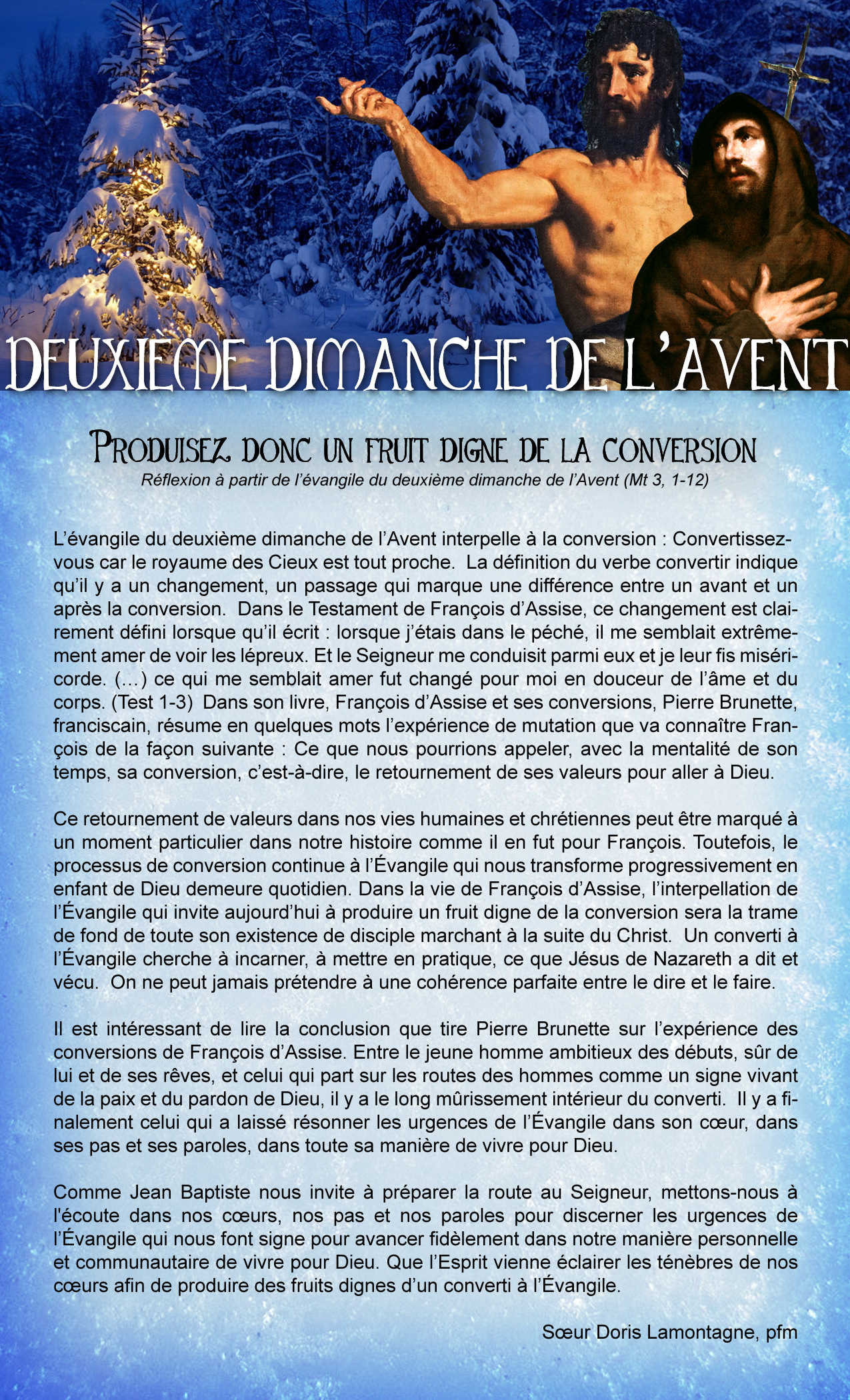 Réflexion de sœur Doris Lamontagne (Petite Franciscaine de Marie) à partir de l’évangile de ce jour (Mt 3, 1-12).