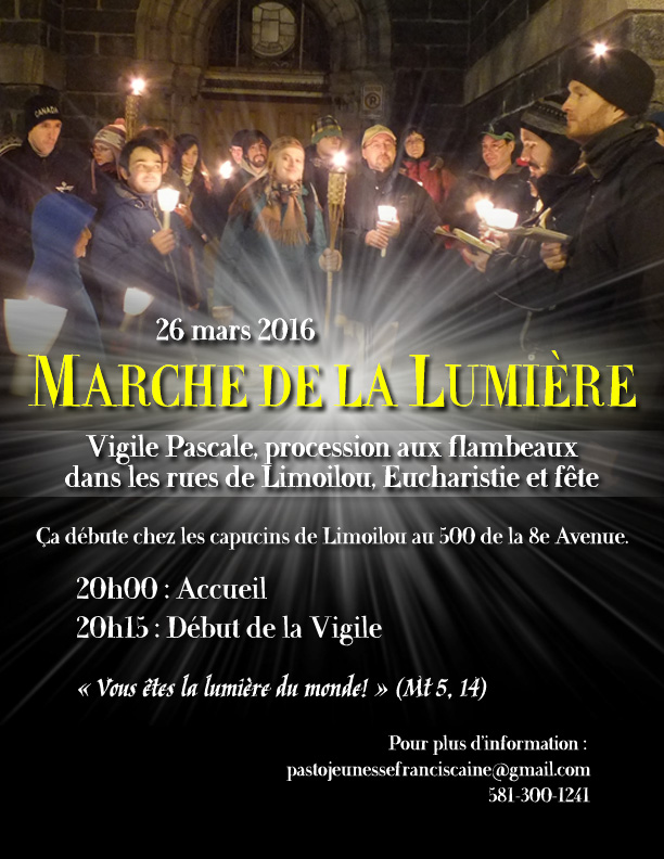 En 2016, la Marche de la Lumière fut organisée par la Jeunesse Franciscaine, l’équipe pastorale de Limoilou, la Famille Myriam Bethléem et le Centre Agapê. La Fraternité du Tau (OFS) et la Fraternité Jésus-Pasteur (les Brebis de Jésus) ont aussi eu une grande part lors de la soirée festive après la messe.
